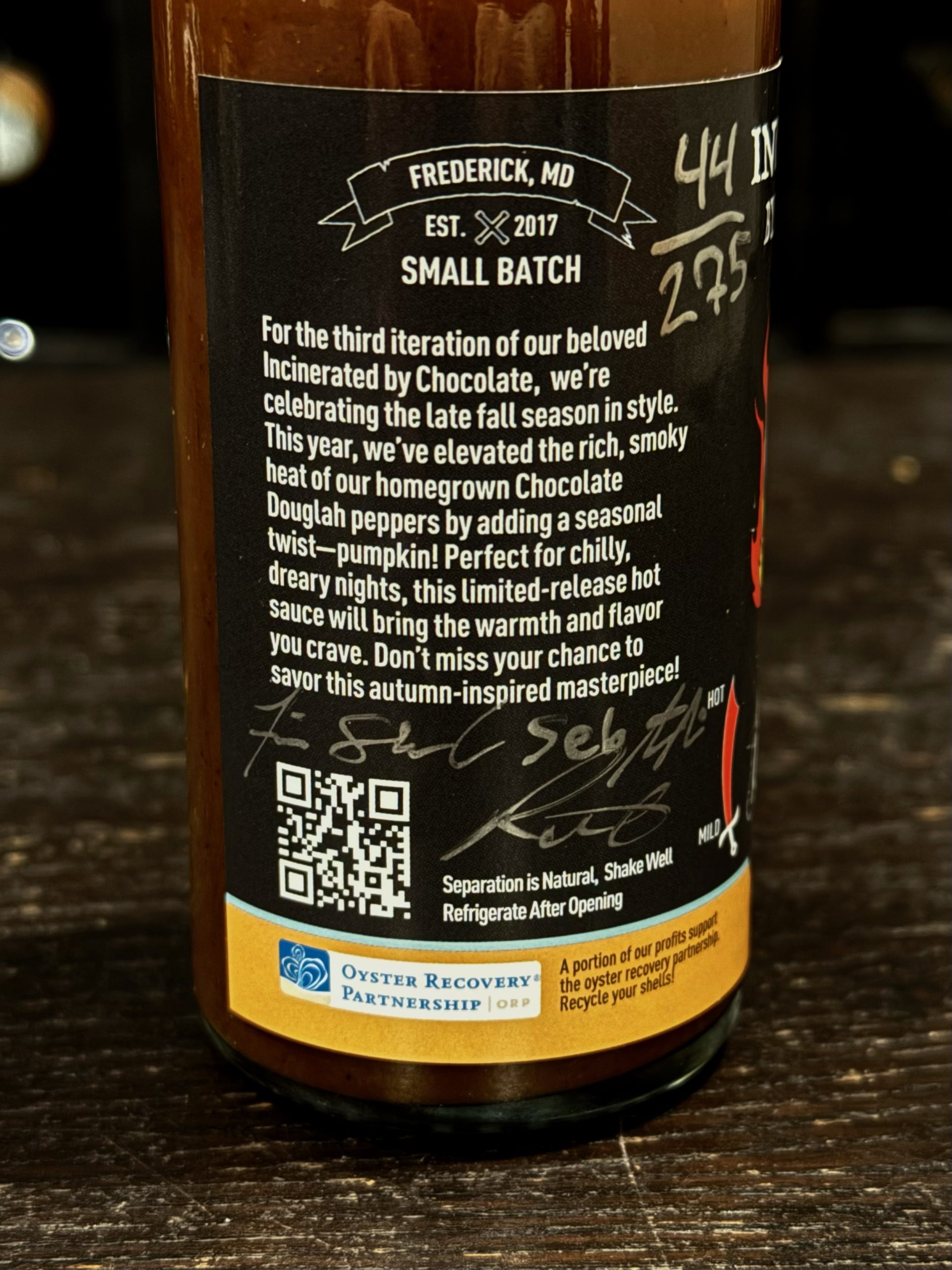 Presenting an ultra small batch, limited edition (only 275 individually numbered bottles signed by the 3 of us) version of our flagship sauce “Death By Chocolate”.  A special harvest version of the original receipe with pumpkin and fresh Chocolate Douglah Peppers grown locally by us.