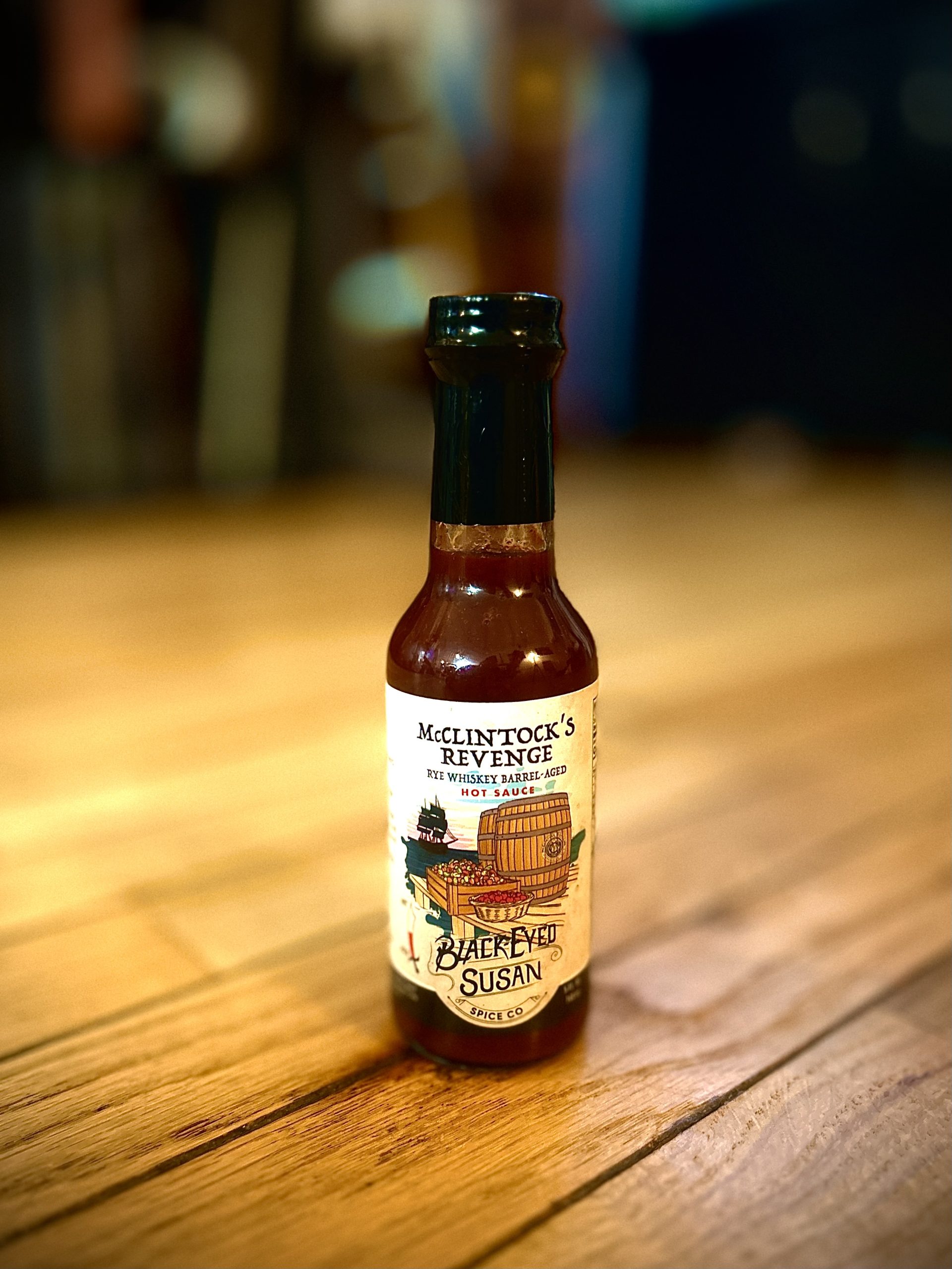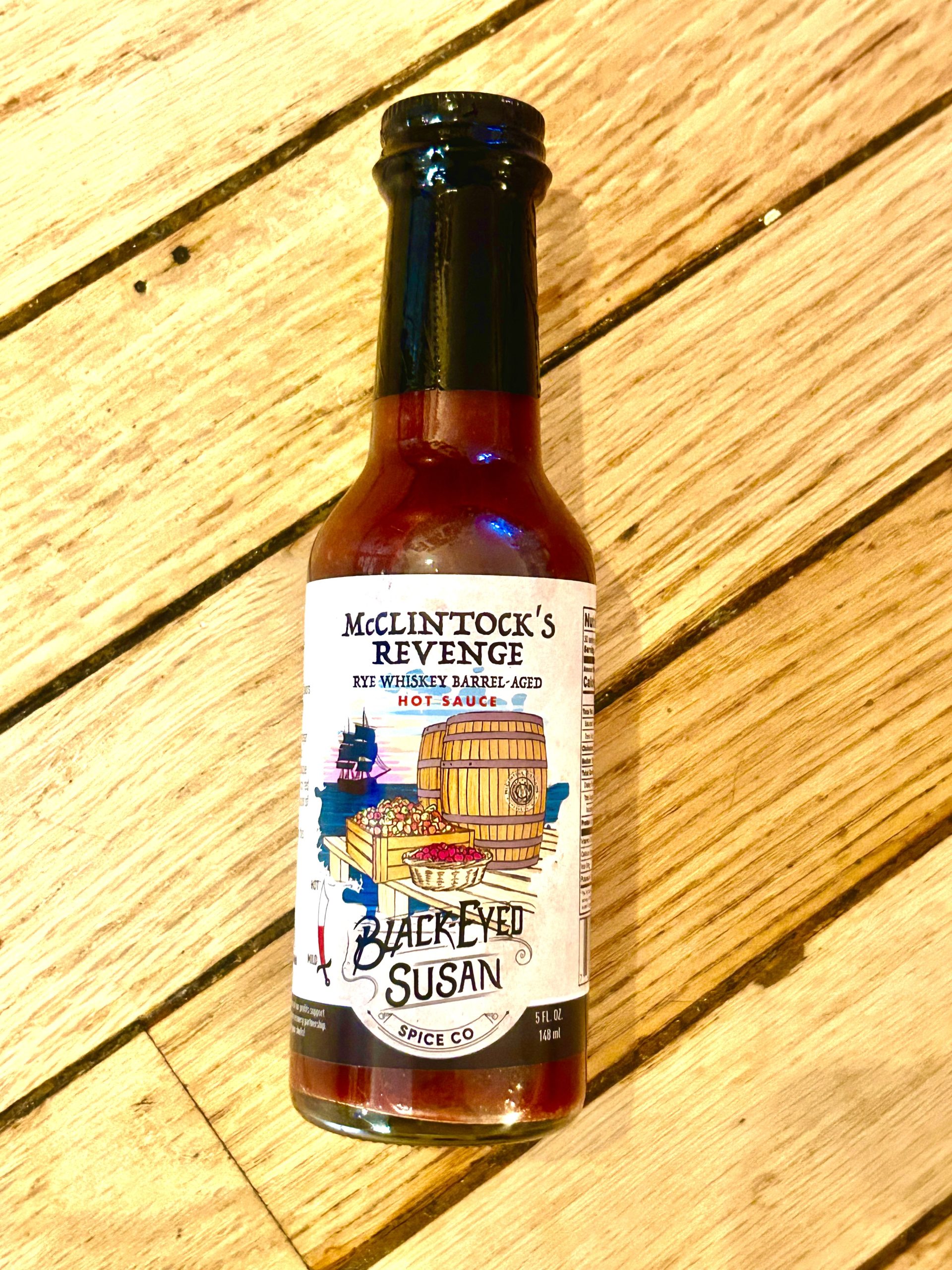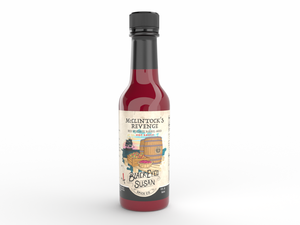 Experience the fiery collaboration of flavors in a habanero hot sauce, masterfully crafted by Black-Eyed Susan Spice Company, infused with apple cider vinegar aged on-site in McClintock Distilling’s Maryland Rye Whiskey barrels. This unique sauce boasts a tantalizing blend of spicy red habaneros, dark cherries, and an explosion of rosemary. The rich, sweet-smoky undertones of aged rye whiskey make this sauce truly pirate-worthy.